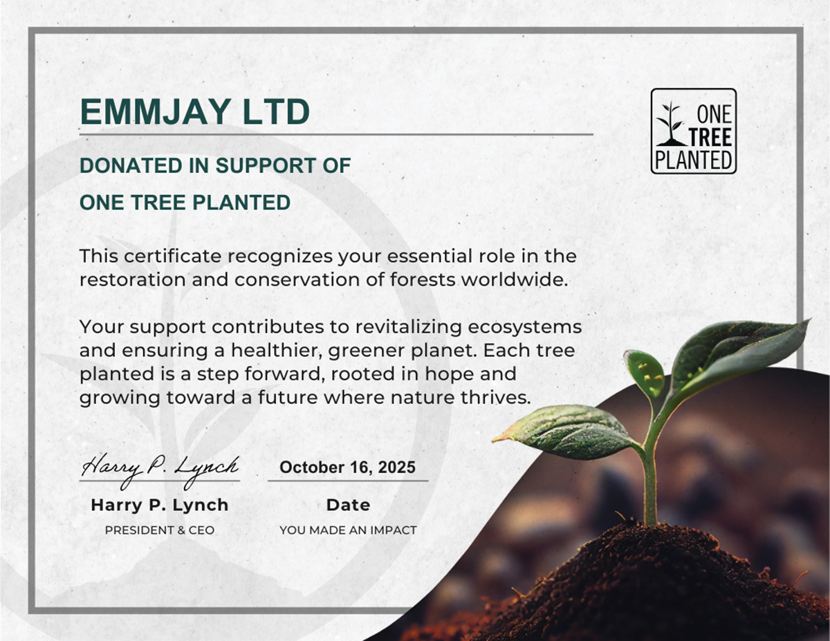 This OneTreePlanted certificate recognises ours and your support to revitalising ecosystems and ensuring a healthier, greener planet.